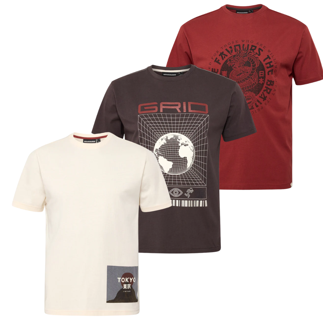 Her får du tre T-shirts med markante grafiske prints og stærke farver, der skiller sig ud fra mængden. Perfekte til et street-inspireret hverdagslook med masser af kant.